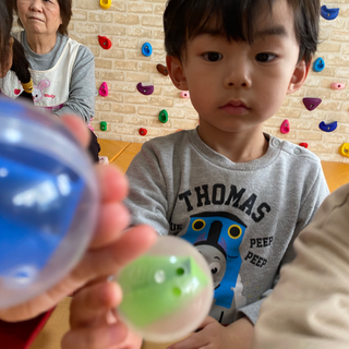 『さるとかに』のペープサートを見てから、ガチャガチャ大会!しっかり説明を聞いてます。